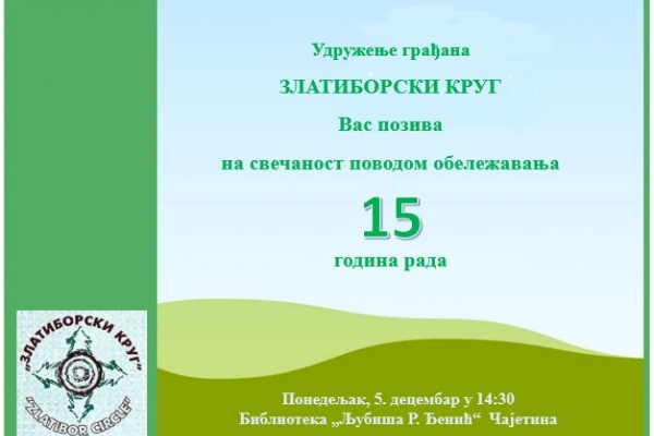 Udruženje građana Zlatiborski krug Vas poziva na svečanost povodom obeležavanja 15 godina rada koja će se održati 05. decembra u 14:30 u Biblioteci Ljubiša R. Đenić u Čajetini.